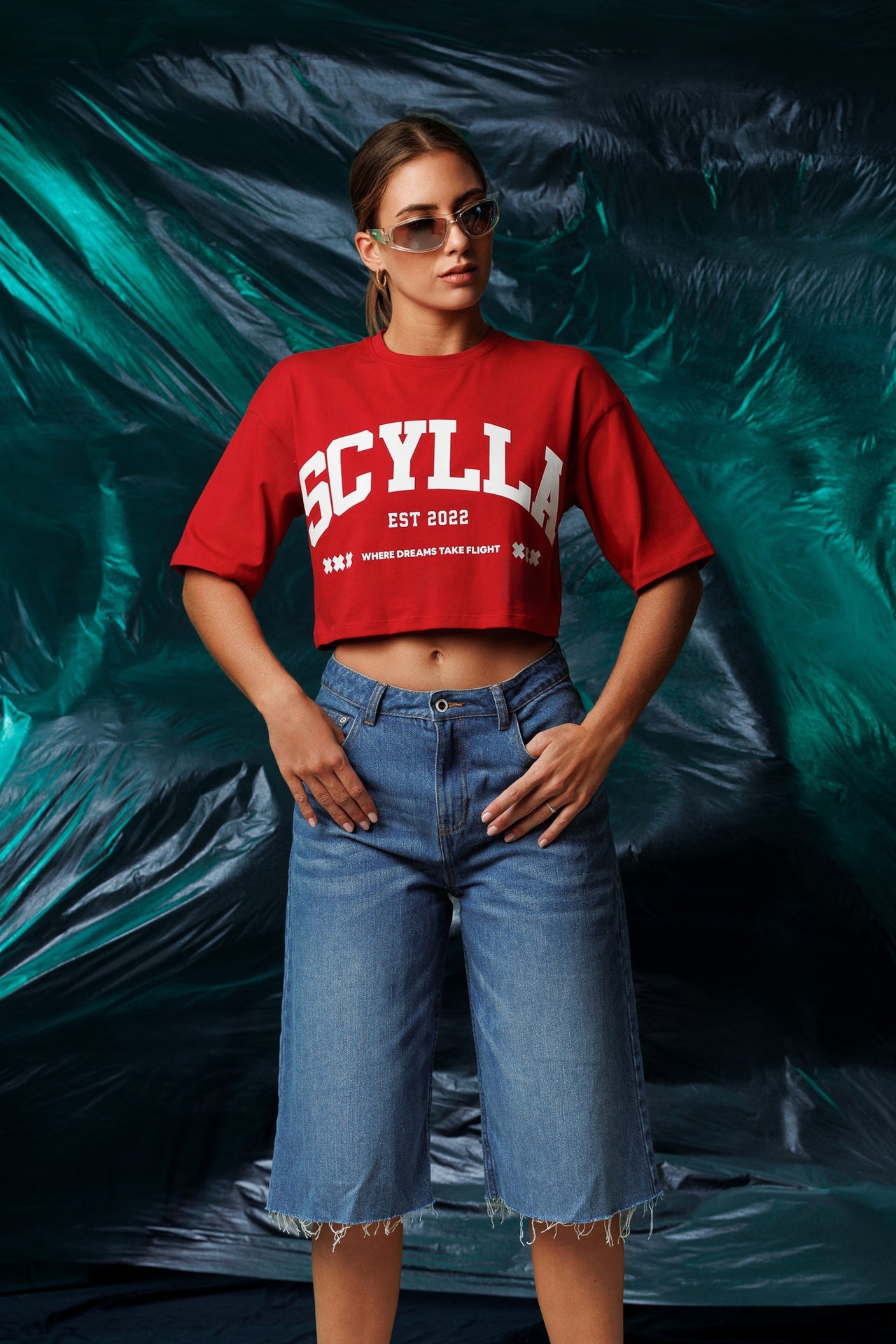 Lead the squad in the Flight Crew Tee — a bold cropped varsity-style top that blends collegiate energy with modern street appeal. Crafted in premium cotton jersey, it features a commanding “SCYLLA” chest print, drop shoulders, and raw-edge hem for a tough-sporty attitude.